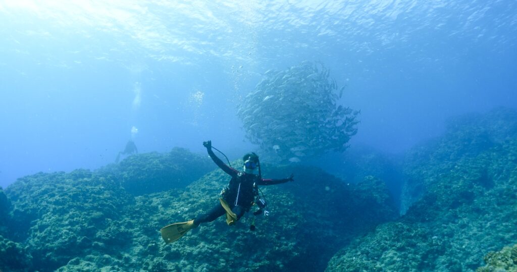 ギンガメアジはのんびりしているので記念撮影もできちゃいます。