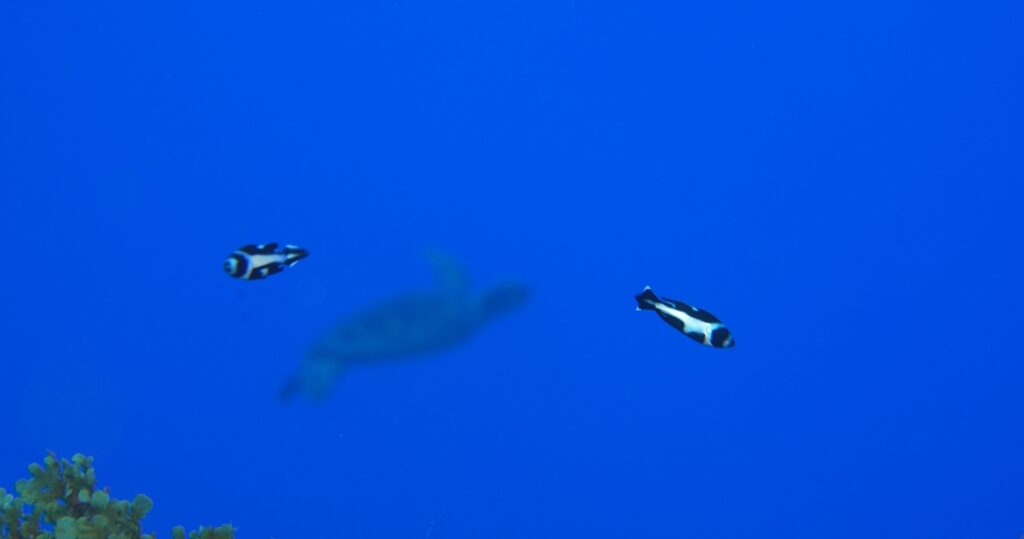 アオウミガメをバックにマダラタルミ幼魚