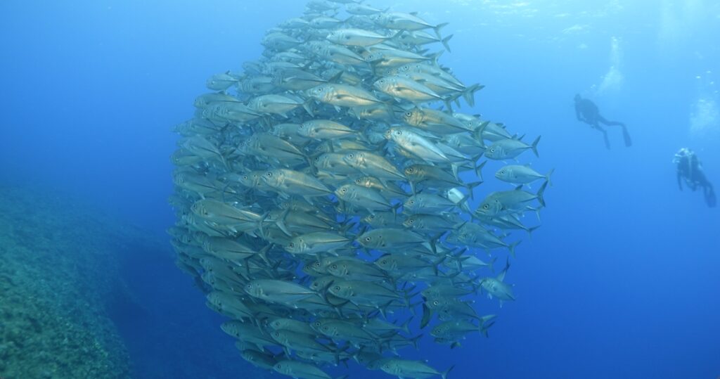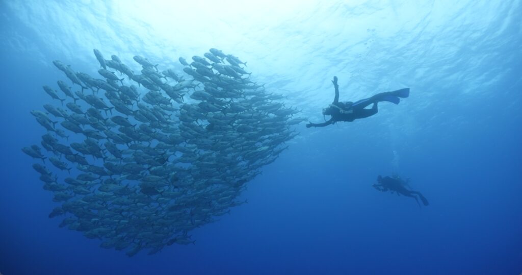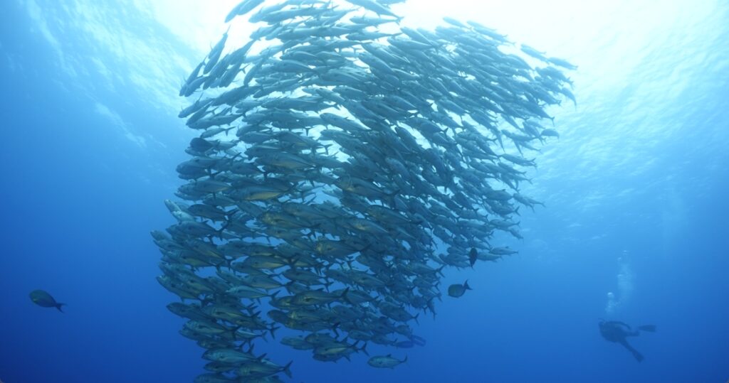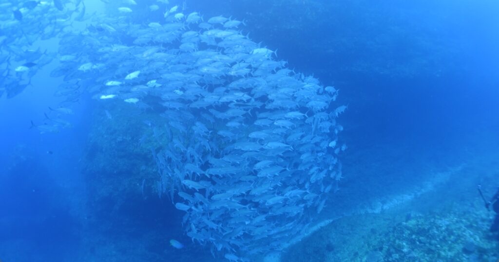 ギンガメアジはエントリー直後に浅場の群れ発見。