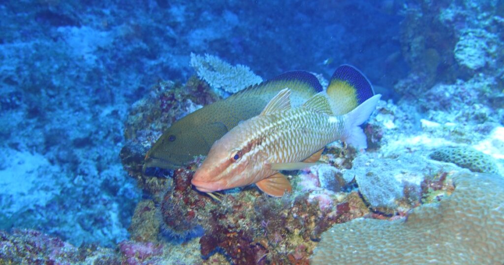 アオノメハタとホウライヒメジが並んで仲良しでした