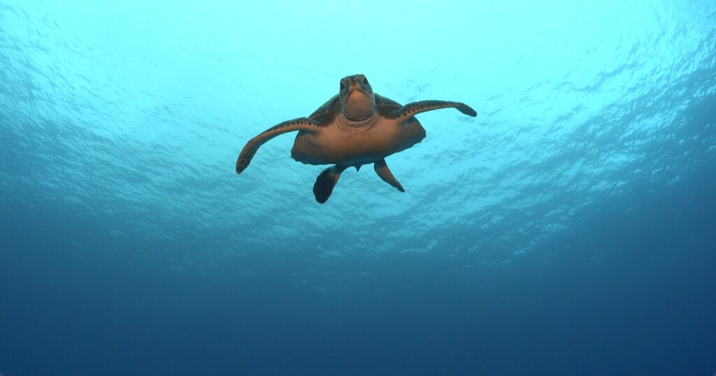 一瞬向かってくるそぶりを見せたアオウミガメ
