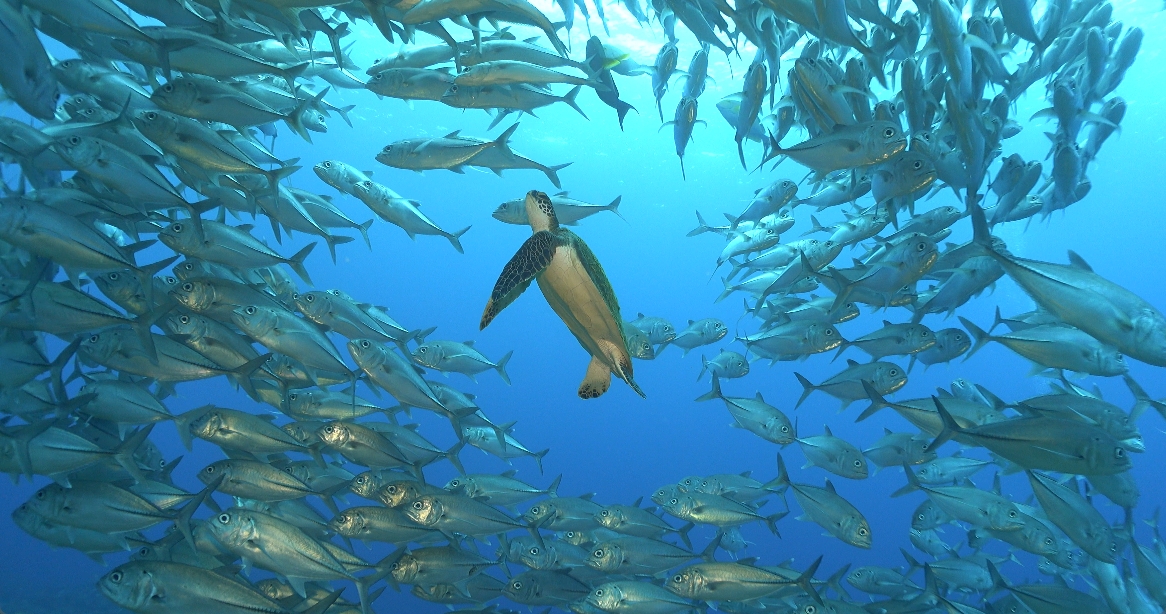 とてもおっとりしていてギンガメアジと一緒に泳いでくれました。